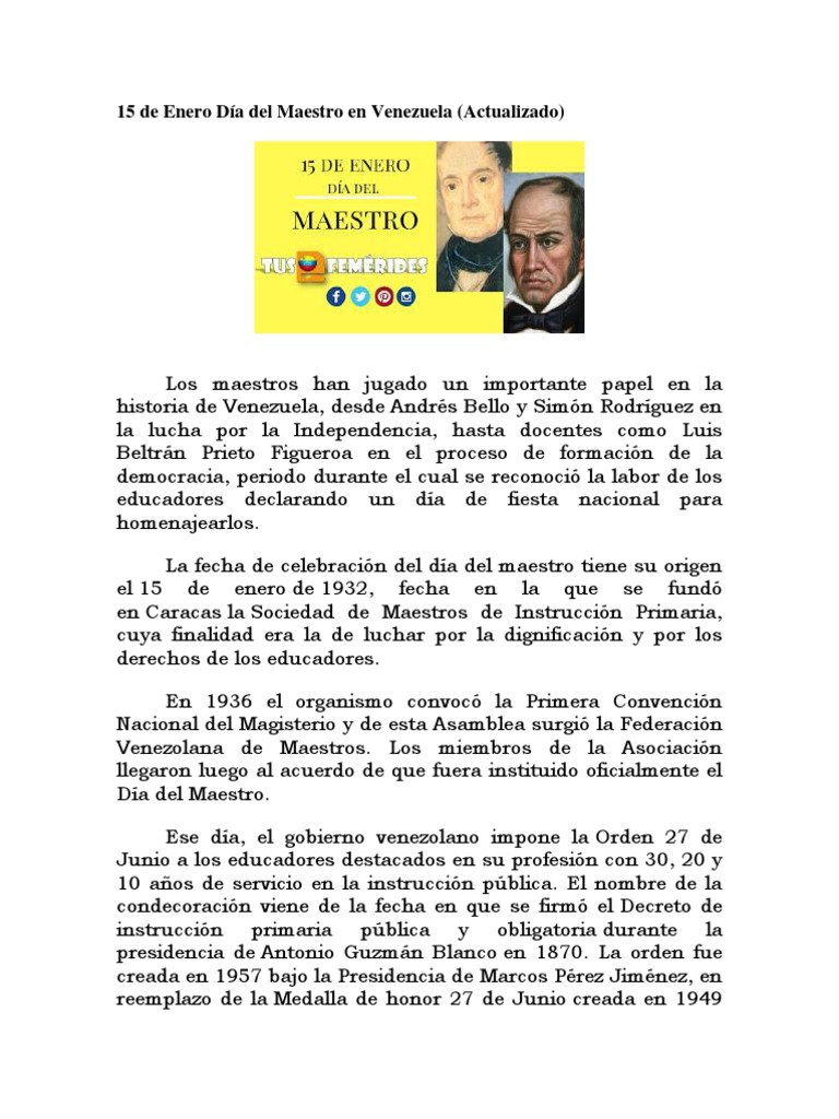 El 15 de enero de 1932, en la sede del antiguo colegio vargas, ubicado entonces en la esquina de cují, se fundó la sociedad venezolana de maestros de instrucción primaria, que cuatro años más tarde se convirtió en la federación venezolana de maestros día del maestro 2021. Venezuela es la economía con mayor riesgo frente al cambio climático… el presidente de la república isaías medina angarita, decretó el 13 de enero de 1945 la celebración del día del maestro el 15 de enero de cada año como un homenaje permanente a los educadores venezolanos.